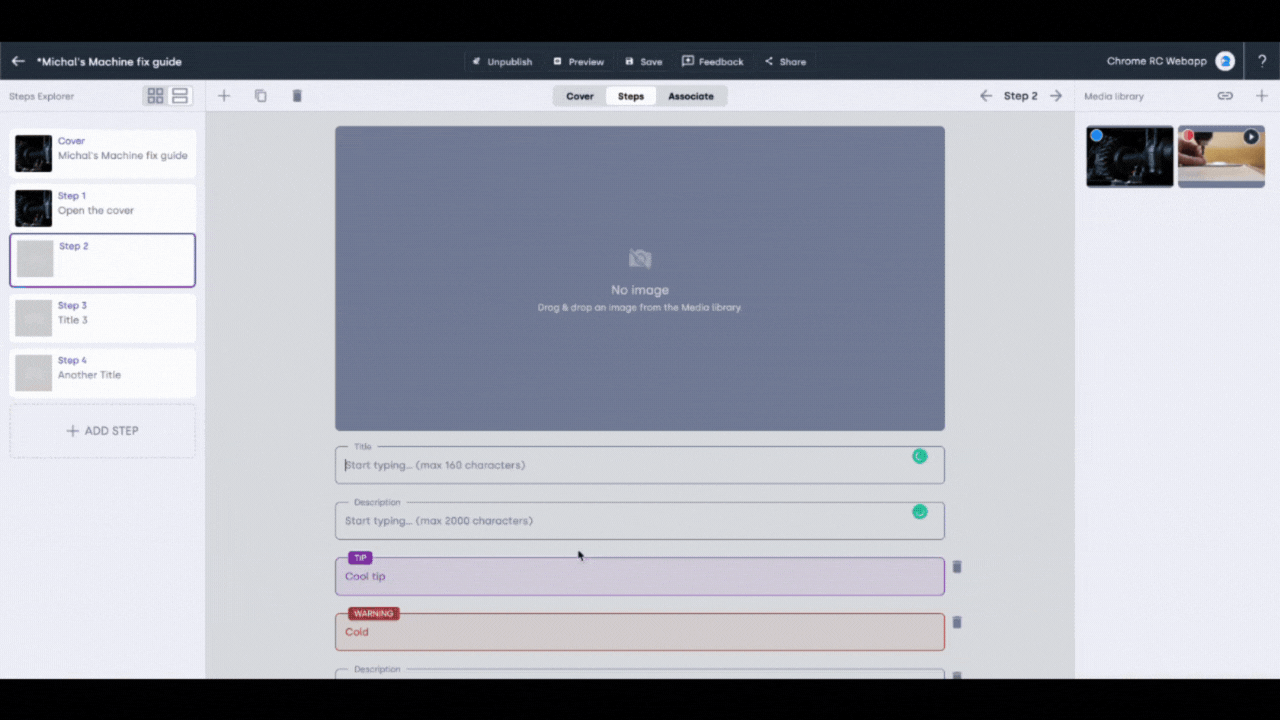 Guide editors in the office can upload or embed videos from YouTube. And workers with the mobile app can record videos on their devices while drafting a guide.