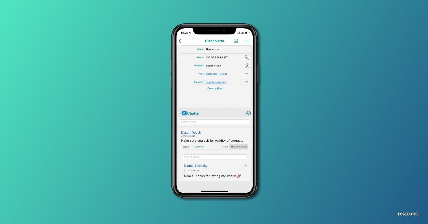 Het samenwerkingsplatform Salesforce Chatter wordt beschikbaar voor alle bedrijven die Resco gebruiken met Salesforce als backend. Hiermee kunnen medewerkers in realtime communiceren en informatie delen over een bepaald record. Er zijn verschillende instellingen beschikbaar voor synchronisatie en offline gebruik van de functie. Gebruikers kunnen kiezen of ze de chat altijd willen synchroniseren als ze online zijn, alleen willen verversen als dat nodig is of tijdens de synchronisatie van alle gegevens.