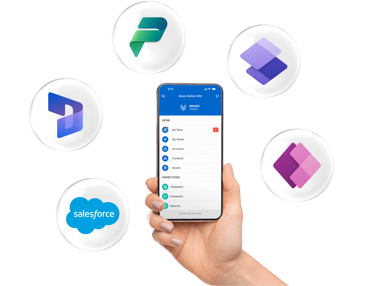 Resco connects with Microsoft Dynamics 365, Power Platform, Salesforce, and Dataverse, alongside key tools for storage, automation, docs, routing, and payment processing.